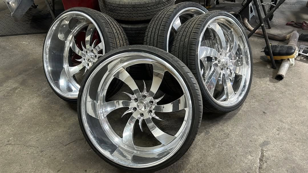 Complementing the lowered suspension is a set of eye-catching custom wheels. These wheels are not your ordinary rims; they are oversized and feature intricate spoke patterns. The contrasting colors and finishes of the wheels add another layer of visual interest to the already stunning exterior.